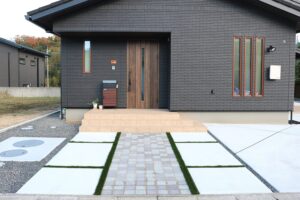 土留めブロックに石彫の素材と、フェンスなどは木彫のものを使用しました。植物も映えて温かみのある雰囲気がまるでお店の入口のようなエントランスができました。
